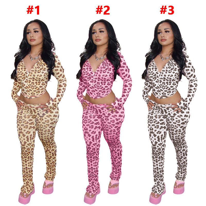 Women's Zipper Hooded Cardigan Leopard Print Trousers Suit